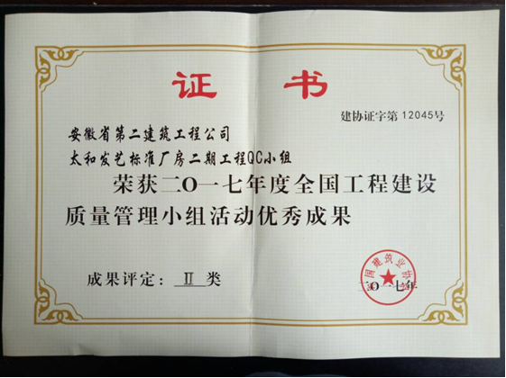 此次成果交流會共有來自全國31個地區,15個行業推薦申報的1000余項QC成果參賽,安徽二建第四分公司太和發藝標準廠房二期工程QC小組之所以能夠脫穎而出,在于分公司、項目部積極響應公司經營戰略方針和創優目標,以降低成本、安全生產、提高效益為目的,在施工過程中,狠抓質量管理,加強過程控制,注重生產和管理相結合。同時,公司還掛牌成立了由公司質量技術部門及項目部質量、技術人員組成的QC質量管理小組,通過“計劃”、“ 實施”、“ 檢查”、“ 處理”(PDCA)的循環方式,進行施工現場調查,對生產實踐中的急難問題開展技術攻關。