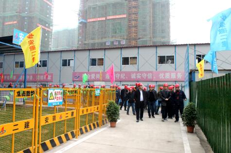 12月1日,安徽二建阜陽大學城•紅街項目、安建楓林源筑項目施工現場舉行了在建項目現場觀摩會。活動旨在深入推進公司基礎管理深化年活動,充分發揮基層黨組織推動發展、服務職工、凝聚人心、促進和諧作用,使黨建工作更好地融入企業的生產經營管理之中,進一步提高施工現場文明生產施工和安全質量管理水平。公司黨委書記劉賢奇、副總經理葉和永出席,所屬分公司黨支部書記、分管安全生產副經理及安全科、綜合辦負責人、全體自營項目項目經理、安全負責人、項目黨支部負責人參加觀摩會。