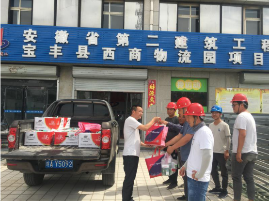 河南寶豐持續高溫天氣,為了確保建筑工人的身體健康,6月4日,寶豐縣西商農產品(冷鏈)物流園有限公司副總經理黃盱為在炎炎夏日辛勤工作的項目管理人員以及一線班組送去了絲絲清涼。