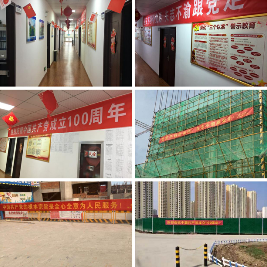 鑄就百年輝煌,書寫千秋偉業(yè)。為迎接中國(guó)共產(chǎn)黨成立100周年,六分公司機(jī)關(guān)及所屬項(xiàng)目部紛紛懸掛張貼了有關(guān)慶祝中國(guó)共產(chǎn)黨成立100周年的標(biāo)語,營(yíng)造濃厚的宣傳氛圍,把黨史學(xué)習(xí)教育進(jìn)一步推向深入,大力營(yíng)造“黨的盛典、人民的節(jié)日”濃厚氛圍,充分展示中國(guó)共產(chǎn)黨百年光輝歷程、偉大成就和寶貴經(jīng)驗(yàn),全面營(yíng)造濃厚氛圍, 共慶黨的百年華誕,大力唱響共產(chǎn)黨好、社會(huì)主義好,改革開放好、偉大祖國(guó)好、各族人民好的時(shí)代主旋律。