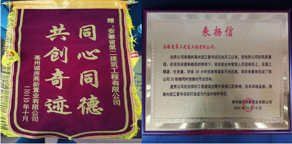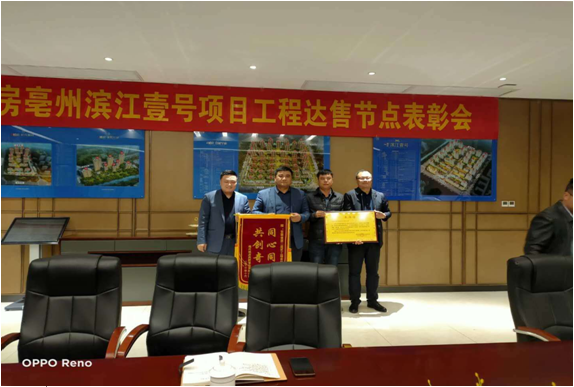 北京城房亳州公司真摯邀請四分公司及項目機關人員參加濱江壹號項目預售表彰會,北京城房對二建公司的努力與付出表示肯定與認可,并頒發錦旗與表揚信。