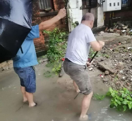汛情就是命令,搶險就是責任。后勤黨員干部全體人員緊急行動。一是立即召開防汛救災搶險工作緊急會議,總經理助理蒯家江要求大家統一思想、提高站位、壓實責任、聽從指揮,加強隱患排查,勇于擔當、不怕吃苦,第一時間發現險情報告并進行處置,確保轄區內住戶的生命財產安全。二是成立后勤黨支部防汛救災搶險突擊小組。主任書記分別任正副組長,并對防汛救災搶險工作做了分工和工作安排。三是立即啟動預案,根據汛情需要科學安排搶險救援任務、防汛物資準備。其次整合后勤維修班人員沖在一線對老舊房區域地面進行排澇排污,清除垃圾和廢棄物。要求全體員工從18日起進入24小時緊急待命狀態,保持手機暢通,隨時準備投入到防汛救災搶險的工作中去。四是加強公司轄區內老舊平房區域的巡查檢視力度,包干劃片作業,責任到人,后勤辦負責人負責總體調度協調,與轄區政府、街道、社區溝通對接。五是加強對各處內澇地點進行排水,疏通管道,積極配合轄區街道做好防汛救災搶險工作。同時對公司生活小區存在安全隱患的住戶,進行引導疏散,截至18日上午10時,14、15棟平房20戶住家已經全部安全疏散。