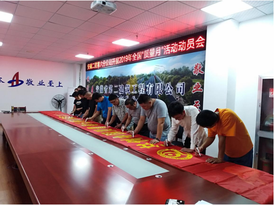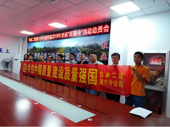 為認真落實安徽建工集團股份有限公司關于開展2019年“質量月”活動的通知,9月3日,第六分公司召開2019年“質量月”活動專題會進行宣貫,組織職工進行橫幅簽名活動,以“共創中國質量 建設質量強國”為主題,大力營造“人人重視高質量,人人創造高質量,人人享受高質量”的良好氛圍,進一步規范質量安全行為,提高質量安全管理水平,全面提升項目管理水平,要求項目部按照“質量月”活動內容,結合項目實際,精心安排、周密部署,以“質量月”活動為契機,加大項目質量宣傳力度,進一步提高全員質量意識,開展質量示范創建,創建公司質量品牌,牢固樹立全心全意為用戶提供優質服務的安徽建工一流企業現象。