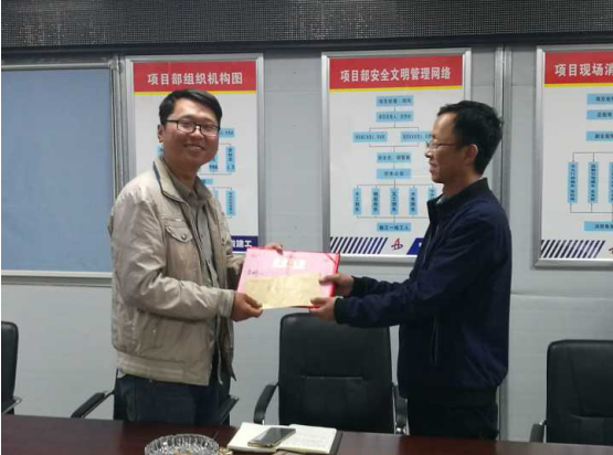 阜陽吾悅廣場項目部四月“閃亮之星”的獎狀在大家的鼓掌聲中送到了李彬手中。