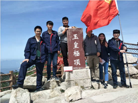 登山小隊在團旗的引領下,從堯山腳下向玉皇山頂進發(fā)。登山途中,大家一邊欣賞美麗的風景,盡情享受新鮮的空氣和明媚的陽光,一邊聊天,暢談著戶外活動的愉悅感受。經過近兩個小時的奮進,在不斷的互相勉勵、加油鼓勁下,登上了峰頂,并合影留住這美好的瞬間。