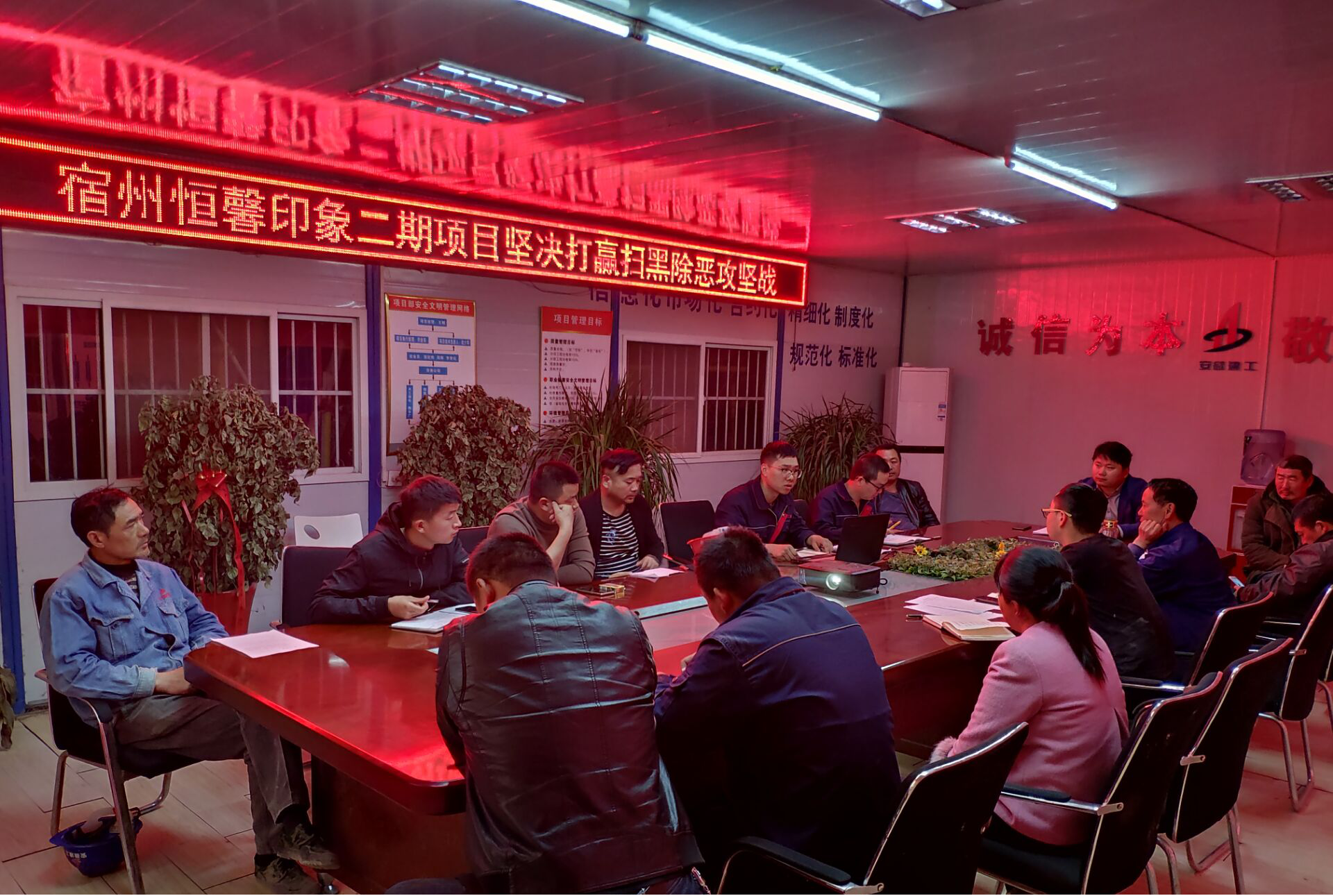 根據公司下發的關于掃黑除惡專項治理行動的通知要求,宿州恒馨印象二期項目于2019年4月15日下午利用生產調度會召開掃黑除惡專題會議,進行了工作部署,成立了“掃黑除惡工作領導小組”。小組辦公室設在安全科,項目經理任組長,技術負責人、生產經理任副組長,各科室負責人為成員,切實形成掃黑除惡整體工作合力。項目部通過懸掛橫幅、led電子顯示屏、各樓棟張貼通告、微信群發等多種方式向施工現場人員宣傳掃黑除惡專項斗爭的參與方式和獎勵規定,有效提升了掃黑除惡效果,為正常的安全生產保駕護航。