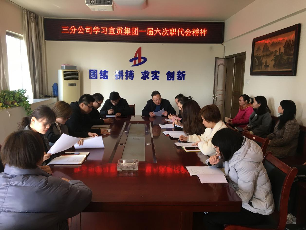 3月12日,三分公司組織機關全體員工在會議室學習宣貫集團一屆六次職代會精神,支部書記陳習武主持會議。